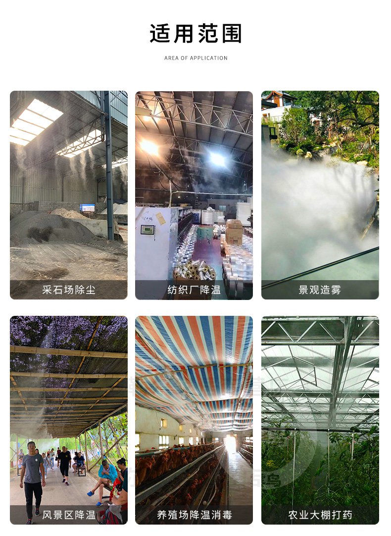 該噴嘴內(nèi)置防滴器,具有停機后不產(chǎn)生滴水現(xiàn)象,常規(guī)布局車間頂部布局霧化噴霧使用。防滴漏噴嘴噴霧細小,霧滴顆粒直徑5-15微米,就有噴射遠,不易堵塞優(yōu)點。