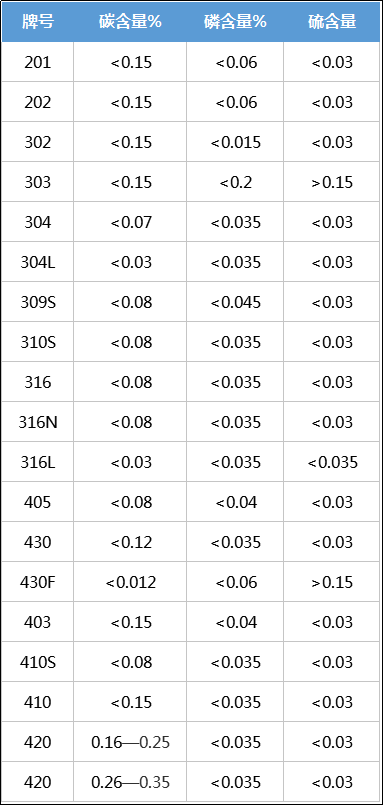 常用不銹鋼型號(hào)常用數(shù)字符號(hào)表示,有200系列,300系列,400系列,它們是美科的表示方法,如201,202,302,303,304,316,410,420,430等,中科的不銹鋼型號(hào)是用元素符號(hào)加數(shù)字表示,如1Cr18Ni9,0Cr18Ni9,00Cr18Ni9,1Cr17,3Cr13,1Cr17Mn6Ni5N 等,數(shù)字表示相應(yīng)的元素含量。